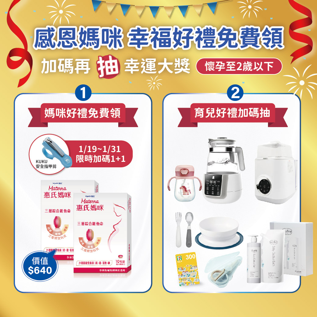 ►即日起至2026/1/31前,只要成功加入惠氏媽媽會員領取迎新禮並填寫活動頁下方表單,就有機會抽中以下好禮!