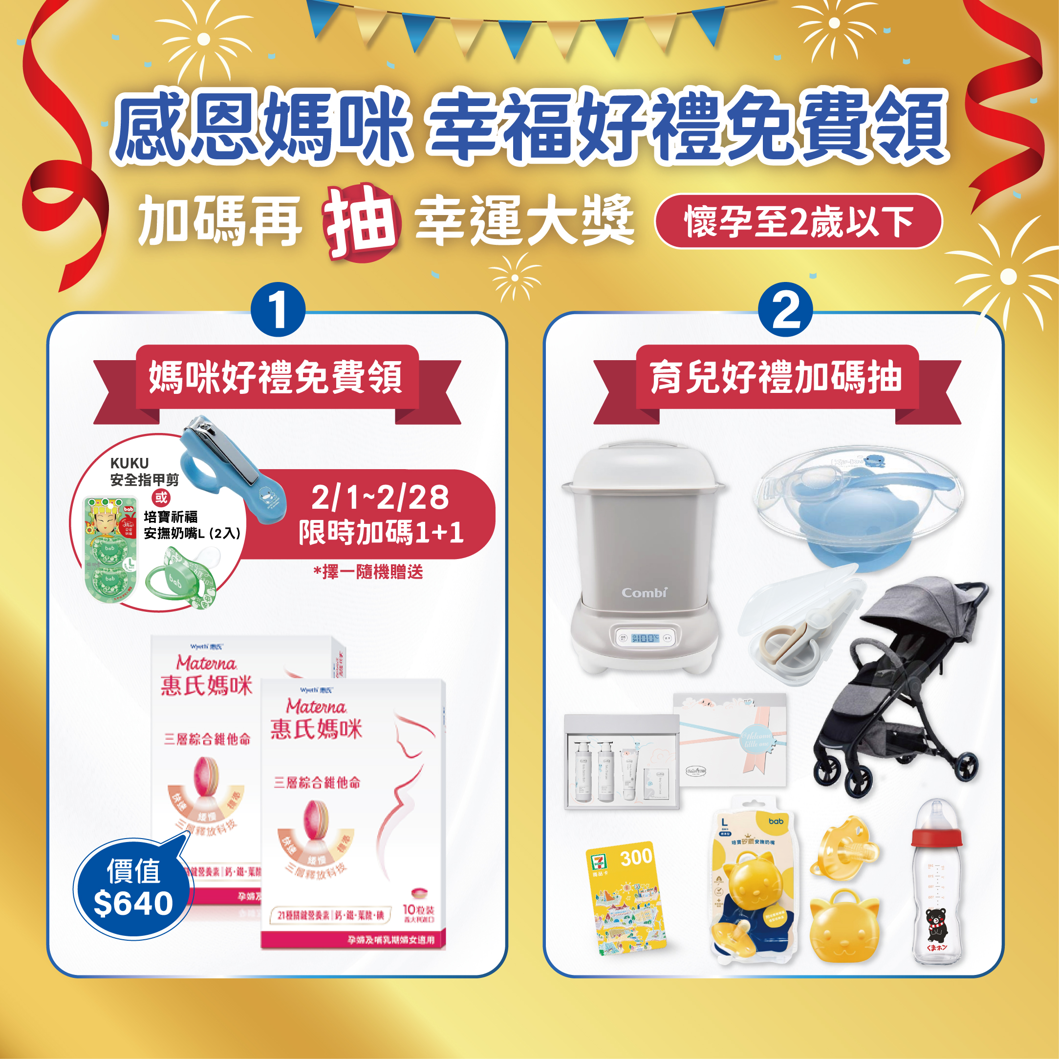 於2026/2/1~2026/2/28 23:59前,成功加入惠氏媽媽會員並完成領取迎新禮,經審核通過後即可獲得【KUKU安全指甲剪*1或培寶祈福奶嘴L(2入)*1】