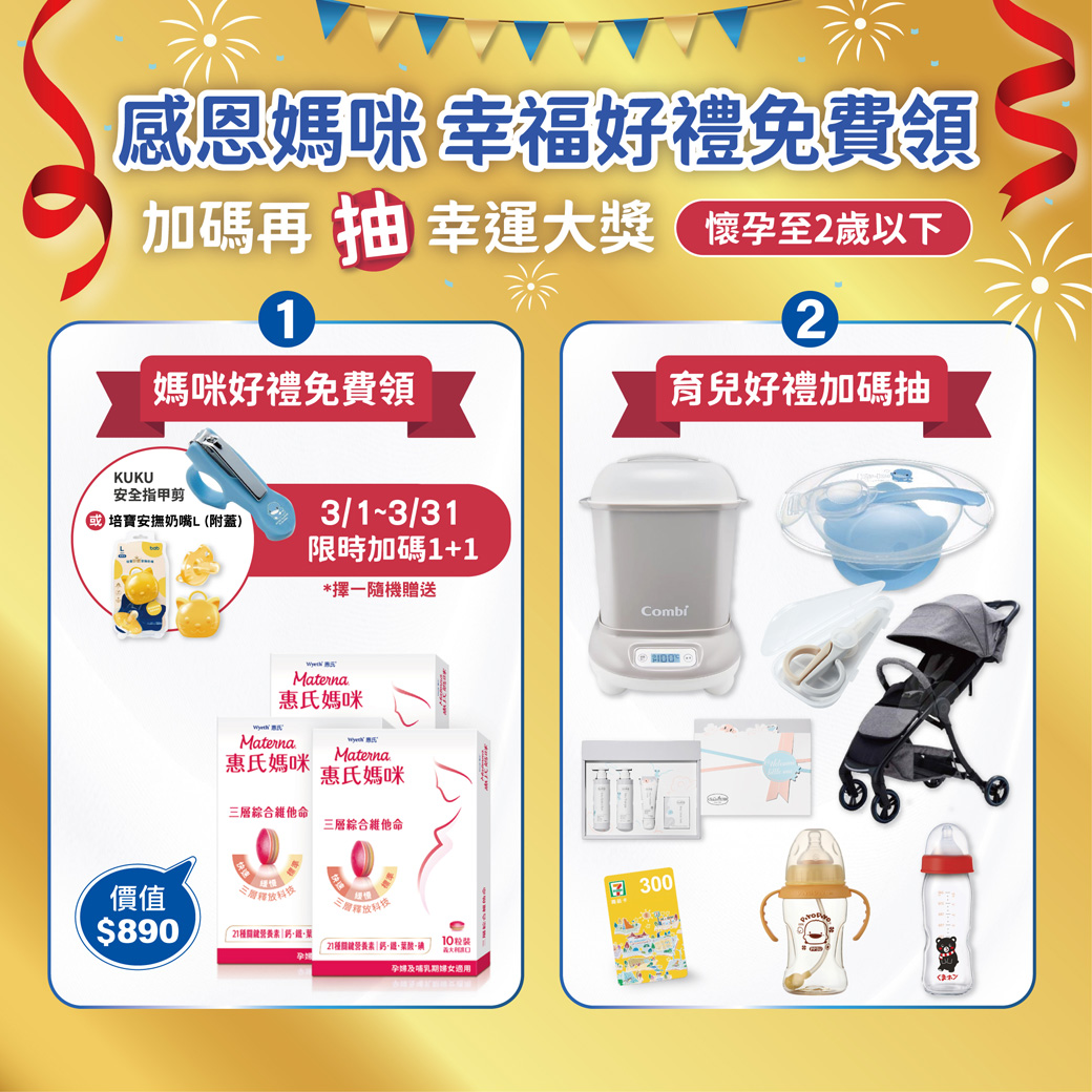 即日起至2026/3/31前,只要成功加入惠氏媽媽會員領取迎新禮並填寫活動頁下方表單,就有機會抽中以下好禮!